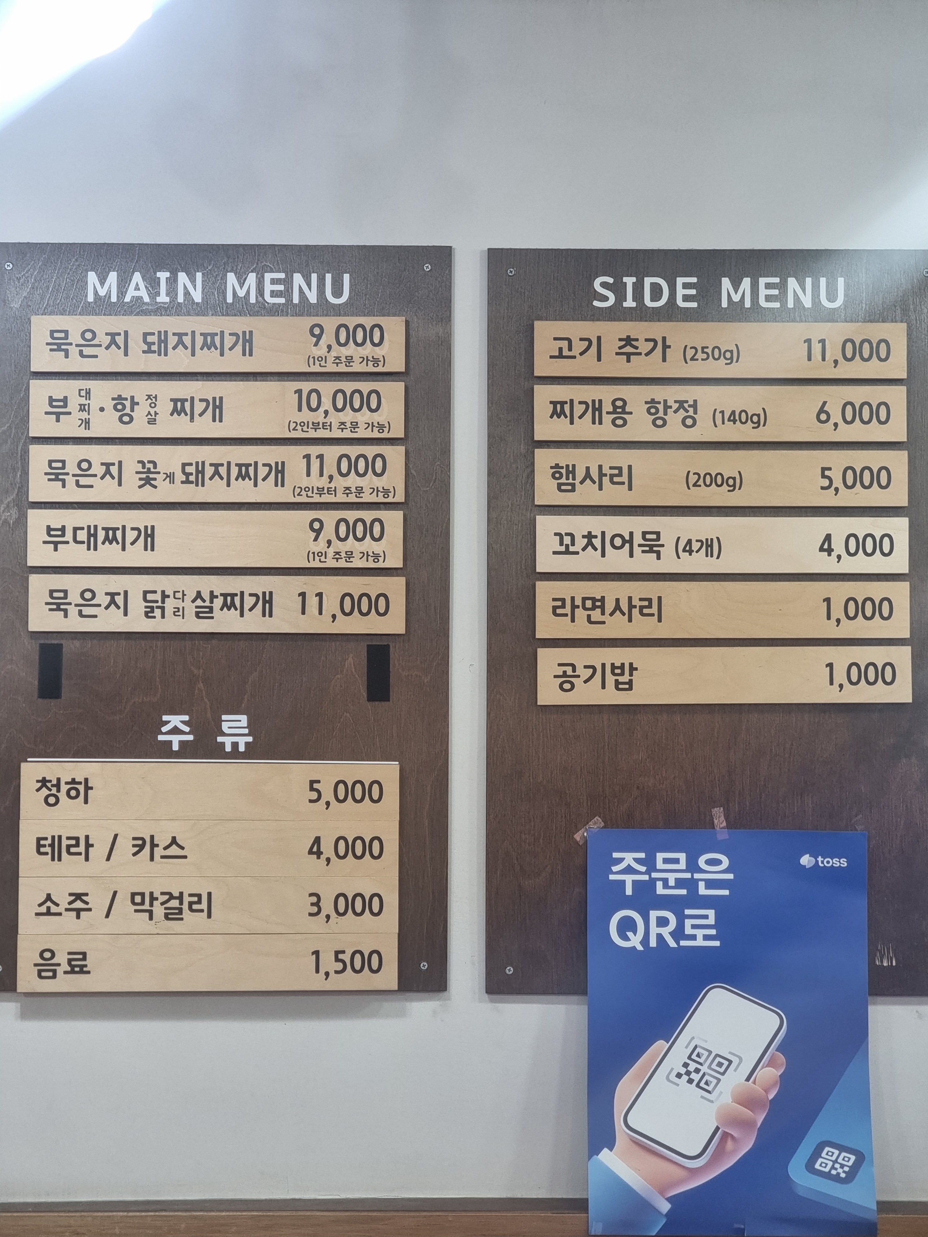묵은지 닭(다리)살찌개 11,000 | 묵은지돼지찌개 9,000 | 부대찌개 9,000 | 라면사리 1,000 | 공기밥 1,000 | 묵은지돼지찌개 9,000 | 부대찌개.항정살찌개 10,000 | 묵은지꽃게 돼지찌개 11,000