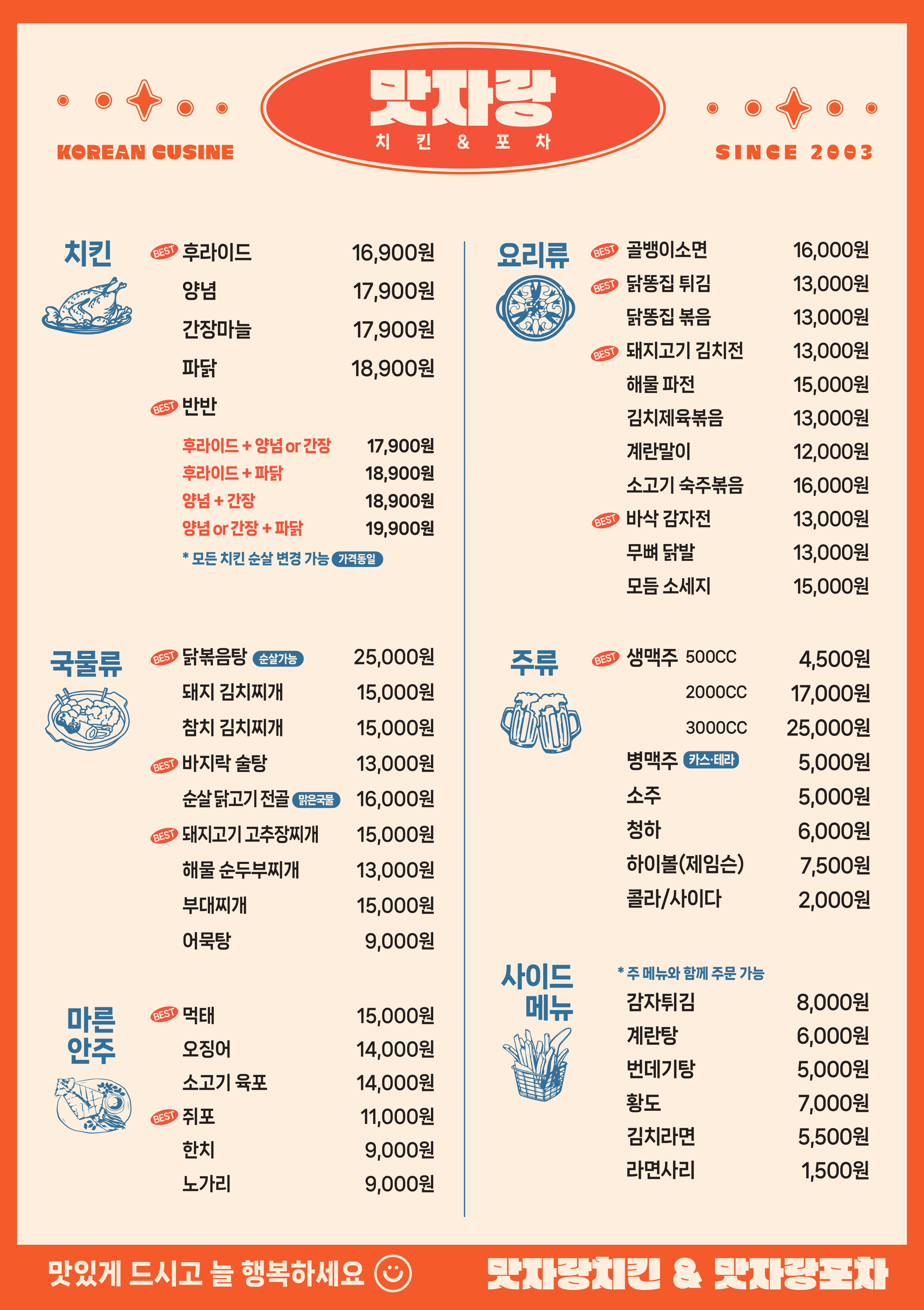 후라이드 17,900 | 골뱅이 소면 17,900 | 깐풍기 21,900 | 돼지고기김치전 13,900 | 무뼈 닭발 13,900 | 똥집(볶음/튀김) 13,900