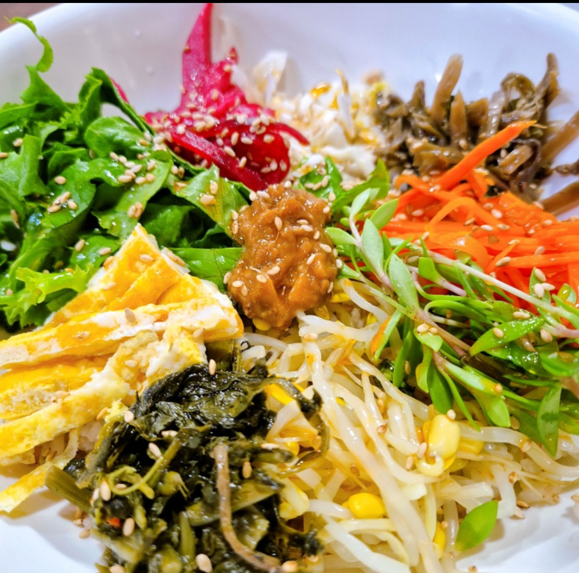 “”맛있는 밑반찬이 가득한 보리밥””