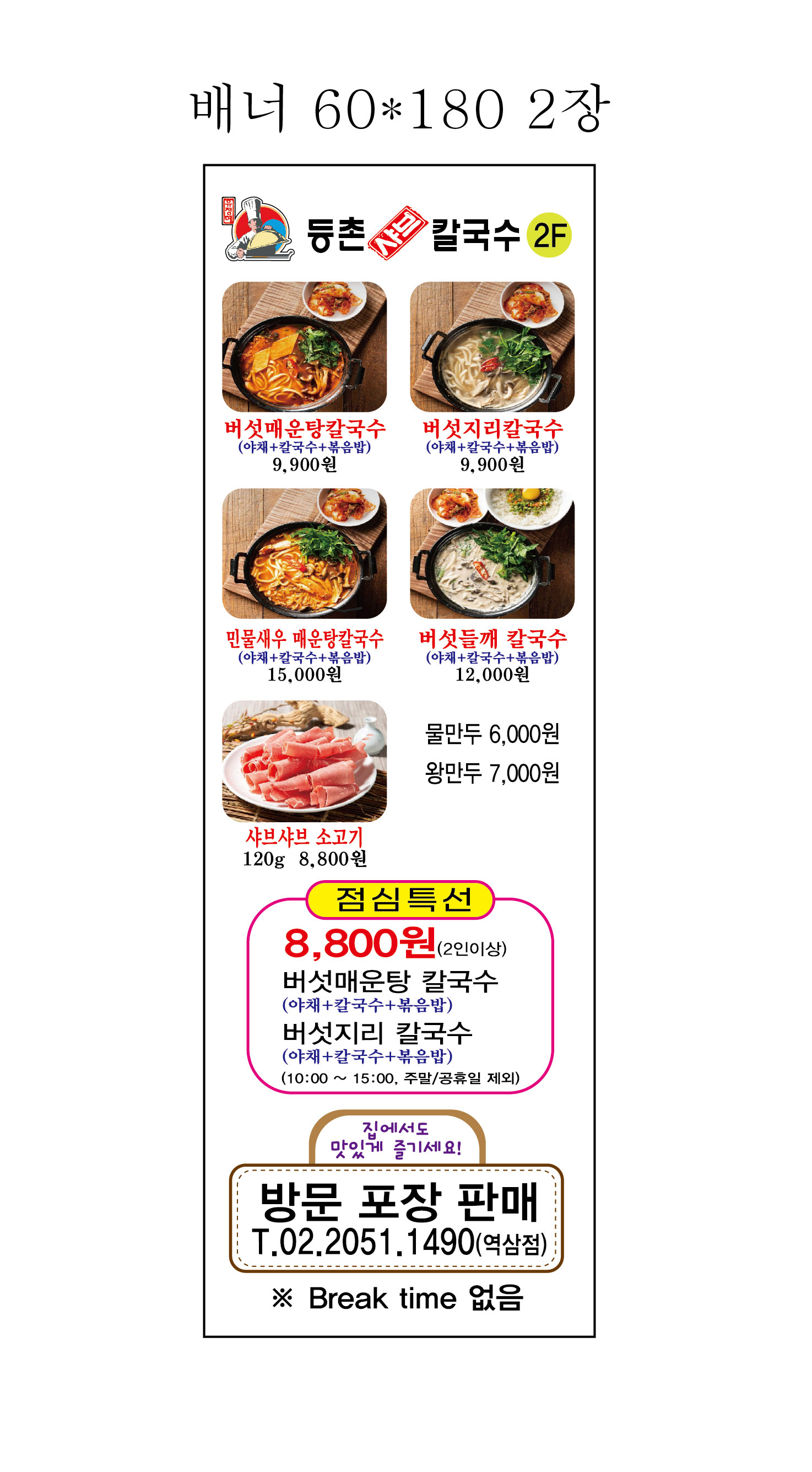 등촌샤브칼국수 (야채+면사리+볶음밥) 11,000 | 평일 점심 등촌샤브칼국수 14,000 | 소고기 180g 11,000 | 물만두 (20개) 6,000