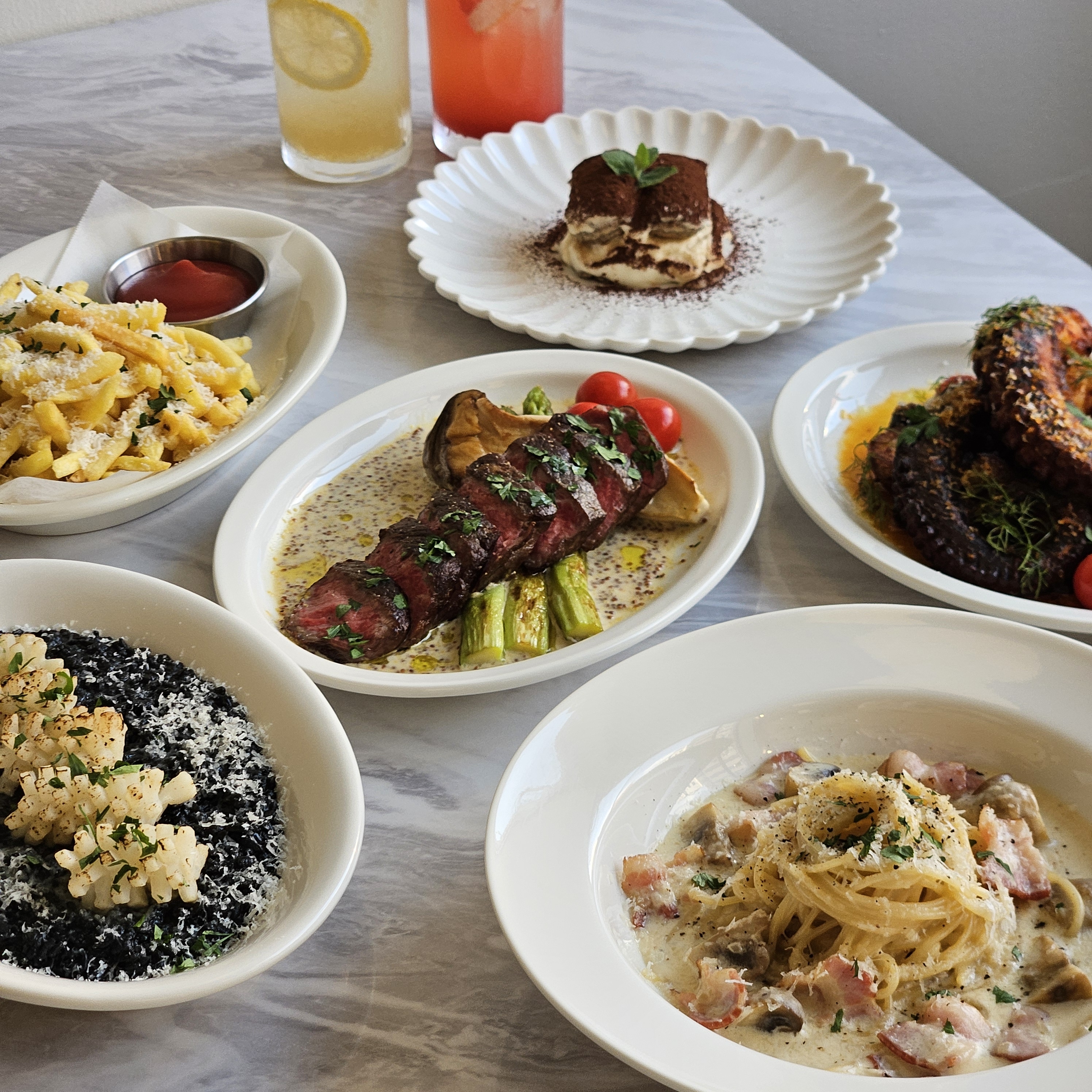 리코타치즈그린 플랫브래드 27,900 | 뚝배기 해산물 토마토 링귀니 24,900 | 채끝등심 스테이크 칩스 42,000 | 새우로제 스파게티니 22,900 | 명란크림 스파게티니 22,900 | 베이컨&로메인 시져샐러드 19,500 | 새우파인애플피자 23,500 | 페퍼로니피자 23,500 | 베이컨토마토 스파게티니 22,500 | 해산물 토마토 스파게티니 22,900 | 라구 볼로네제 스파게티니 19,500 | 봉골레 스파게티니 19,500 | 새우갈릭오일 스파게티니 19,500 | 명란오일 스파게티니 19,500 | 까르보나라 스파게티니 22,900 | 해산물토마토 리조또 21,500 | 새우로제 리조또 22,500 | 버섯크림 리조또 22,500 | 매콤 새우비스큐리조또 22,900 | 고르곤졸라 with 유자소스 21,900 | 치킨윙 메가크런치후라이 22,900 | 트러플메가크런치후라이 6,900 | 아메리카노 4,500 | 카페라떼 5,000 | 카푸치노with시나몬 5,000 | corkage (병당 가격) 20,000 | 스텔라 아르투아 (병맥주) 7,500 | 빅웨이브(병맥주) 8,000